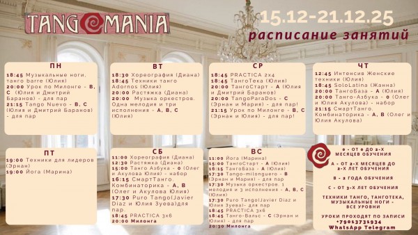 Расписание 15.12-21.12.2025 г Два мастер-класса Хавьера Диаса " Puro Tango" на этих выходных 20 и 21 декабря в ТАНГОМАНИИ! Хавьер Диас Известный в России аргентинский маэстро танго, танцующий с 1997 года. Стиль, в котором танцует Хавьер Диас, отличает элегантность и безукоризненное следование традиции классического аргентинского танго. Его уроки - это всегда заряд энергии и новые открытия. Хавьер знает как донести суть танго, как передать ощущения пары как единого целого. Хавьер: «Puro или Чистое танго - это простое танго, прогулка и близкое объятие, с чувственными паузами. Это идеальная простота, которой раньше славились старые мастера и то, чего некоторые из нас пытаются достичь. Простое танго - это непросто, но у нас есть возможность и время, чтобы научиться». Программа Weekenda 20 декабря, суббота 17:30 - Puro Tango. Последовательность шагов маэстро старой школы. Javier Diaz и Юлия Зуева. В парах. 18:45 - практика для дам.21 декабря, воскресенье 17:30 Puro Tango. Близкое объятие, барида и арастре с изменениями динамики. Javier Diaz и Юлия Зуева. В парах. 18:45 - практика для дам.Прочувствуйте элегантность и изысканность стиля! Стоимость (Цена указана за 1 человека): за 1 мастер-класс 900 руб. при оплате до 20.12.25 за 1 мастер-класс 1200 руб. с 20.12.25 В пятницу 19 декабря в 19:00 второе занятие по техникам Аргентинского танго для лидеров в ТАНГОМАНИИ с Hernán Brusa! Новый набор на уроки для начинающих Танго Азбука:четверг в 20:00 суббота в 15:00. Преподаватели: Олег Юматов и Юлия Акулова Эксклюзив - спецкурсы с Юлией Зуевой: "Музыкальные ноги, танго barre" в понедельник для тангер, "Техники танго Adornos" во вторник в 18:45 для всех уровней, "ТангоТека" по средам в 18:45 - специально для начинающих, Интенсив "Женские техники" по четвергам в 12:45. Уроки проходят по записи:По всем вопросам обращайтесь в ЛС администратору Тангомании или Wа/Tg +79013731934 | |