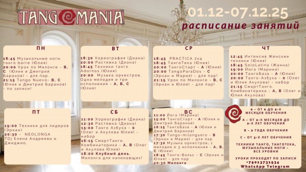 Расписание 01.12-07.12.2025 г . Открываем новый набор на уроки для начинающих Танго Азбука: четверг в 20:00 суббота в 15:00. Преподаватели: Олег Юматов и Юлия Акулова Старт группы 27.11.25. "Музыкальные ноги, танго barre" в понедельник для тангер, "Техники танго Adornos" во вторник в 18:45 для всех уровней, "ТангоТека" по средам в 18:45 - специально для начинающих, Интенсив "Женские техники" по четвергам в 12:45. "Смарт ТАНГО. Комбинаторика" в четверг 21:15 и суббота в 16:15. Всего 3 урока по Мужским техникам в Декабре - 5, 19 и 26 декабря с Эрнаном Бруса в ТАНГОМАНИИ!!! Не пропустите!![]() В преддверии Дня Танго приглашаем на Клубный вечер Тангомании - Милонга для начинающих!06 декабря (суббота) Начало в 18:00. По регистрации! Уроки проходят по записи:По всем вопросам обращайтесь в администратору Тангомании Wа/Tg +79013731934![]() | |